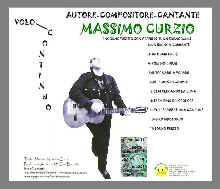 Massimo Curzio sembra aver trovato finalmente un suo equilibrio, tra istinto e ragione, tra passato e presente, tra ermetismo surreale e realtà quotidiana. Infatti nel suo nuovo cd “Volo continuo“ prodotto da Ciro Barbato su etichetta Smile Records con la collaborazione della Federazione Italiana Musicisti troviamo dei ritmi irresistibili uniti a sonorità attuali, per allontanandosi da quell’immagine intimista e sofferente di cantautore; si presenta sul palco a volte con un corpo di ballo e usando una gestualità teatrale/recitativa, dopo che si è fatto la domanda ! ballerino o prigioniero ? ha preso una decisione. Cerca di giocare con le melodie e renderle non prevedibili come sempre, gioca con le parole che a volte diventano quasi un rap, parole ermetiche o sposate a concetti semplici usciti di getto, che esprimono comunque sempre una riflessione sulla vita, i testi rimarranno sempre profondi e indice di punta di forza, parlano di nuovi messaggi, cosa che ha condiviso con tutta una generazione precedente di cantautori/profeti. Ma oggi il rapporto con la nuova musica, quella tecnologica è più sereno. Pubblica nel 2005 “ Specchio Chiaroâ€, il libro di poesie “(S)punti di fuga†,“Volo Continuo†nel 2008, i suoi brani saranno scelti e inseriti in molte compilation. Nelle ultime composizioni Massimo si è lasciato trasportare solo dalla sua musicalità per dare fiducia all’istinto creativo, senza mai però perdere di vista la ricerca, o almeno il tentativo di soluzioni particolari. Infondo dice: “Voglio portare a termine il discorso che avevo iniziato…con la canzone impegnata d’autore “ Ti regalo la mia ombra†e a quella domanda, è di risposta la nuova “ Un sogno ricorrente †dove si presenta con due ballerine stile anni ’80, per parlare di un sogno che ha faceva spesso… quello di volareâ€. Ascoltare i suoi brani è una cura per salvaguardarne lo spirito, perchè attraverso le canzoni Massimo può portare un po’di benessere, del resto non nega di ispirarsi a grandi artisti come Jhon Lennon che ha fatto cose complesse e sperimentali ma al tempo stesso di una semplicità fruibile a tutti come l’eterno brano “Imagine â€.